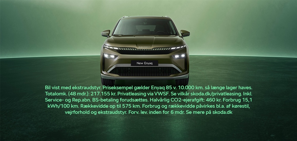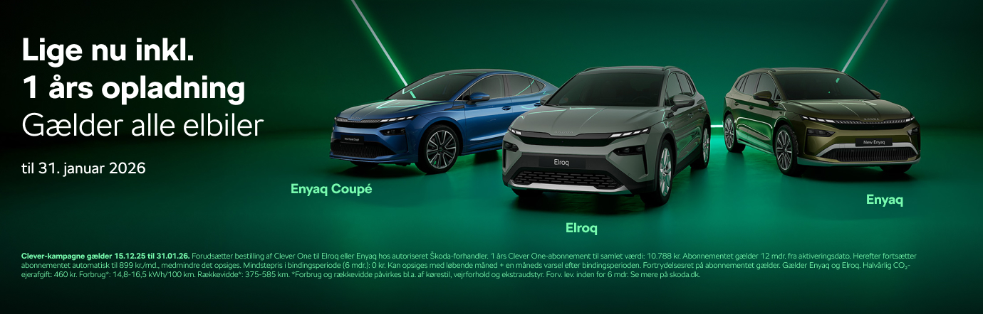 Clever-kampagne gælder 15.12.25 til 31.01.26. Forudsætter bestilling af Clever One til Elroq eller Enyaq hos autoriseret Škoda-forhandler. 1 års Clever One + evt. energitillæg med standardinstallation til samlet værdi (privatkøb): 12.087 kr. Mindstepris i bindingsperiode (6 mdr.): 0 kr. Kan opsiges med løbende måned + en måneds varsel efter bindingsperioden. Fortrydelsesret på abonnementet gælder. Tilbagebetaling: Udregnes som dit kWh-forbrug x gns. strømpris pr. kWh i DK kl. 24-06 i måneden. Læs mere: clever.dk/tilbagebetaling. Gælder Enyaq og Elroq.
